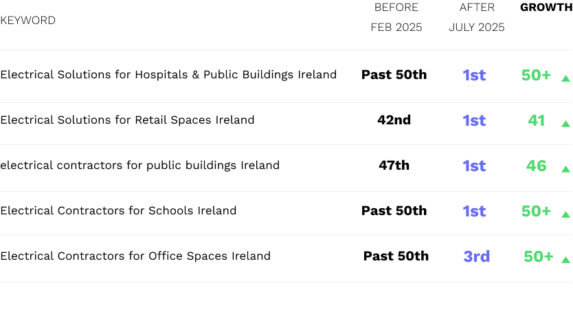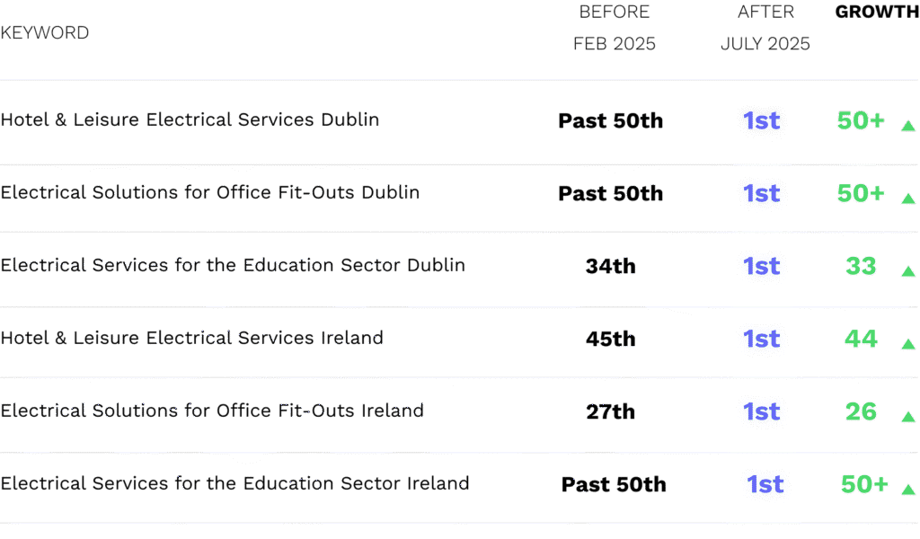 Keogan Electrical are known for major projects with clients like Google, the Mater Hospital, and UCD, they were invisible online, until now. With their new digital presence, they rank #1 in Ireland and finally showcase the high-calibre work they’ve been delivering for decades.