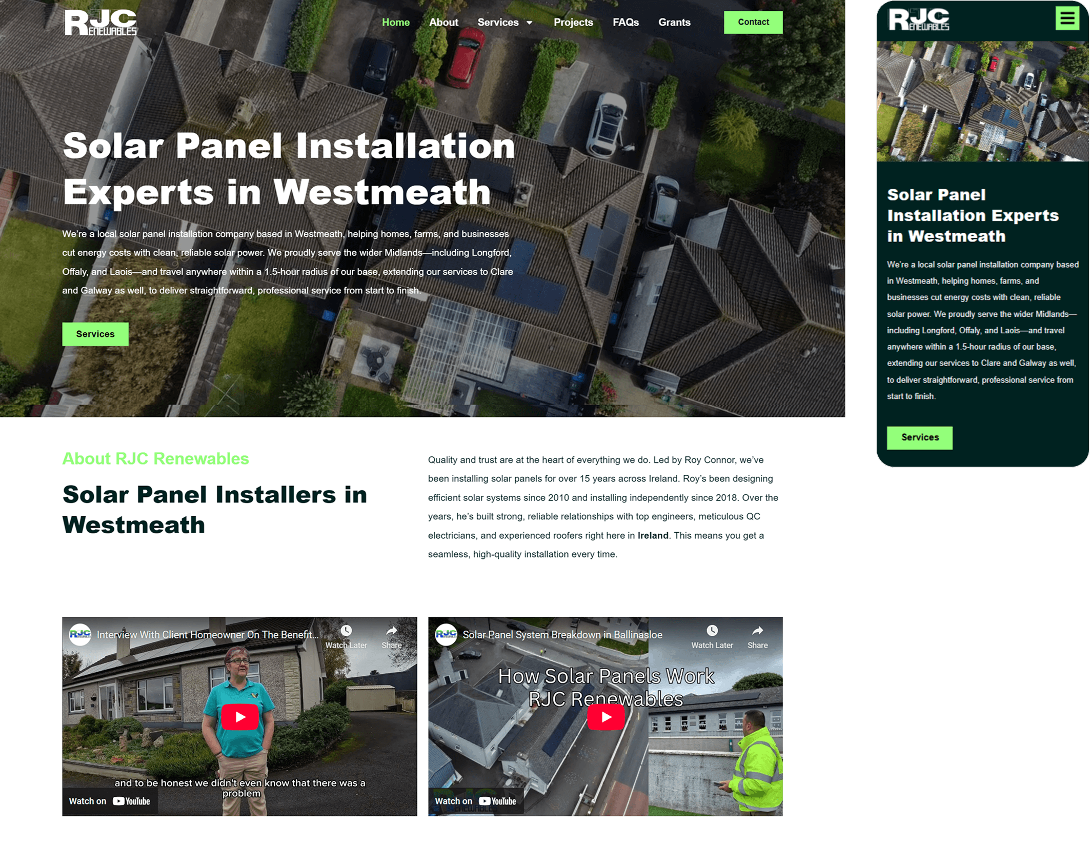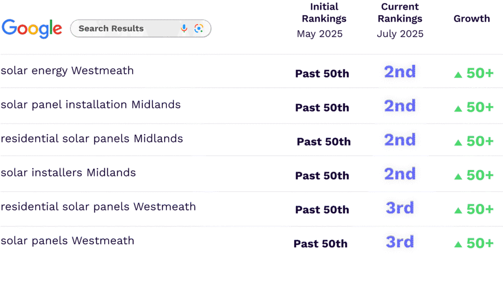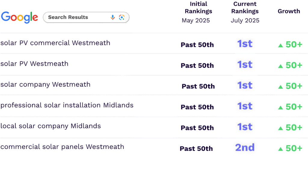 Doing their foundations properly resulted in a consistent flow of residential and commercial leads. RJC Renewables are now ranking in the top 3 for high‑intent searches like ‘solar company Westmeath’ and ‘solar PV Westmeath’. This improved visibility puts them front and center when customers search locally for solar solutions.